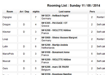 Rooming list arrivées et départs